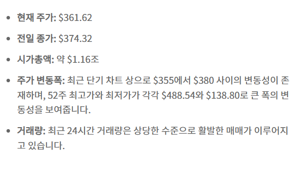테슬라는 전기차 시장에서 선두주자로 자리 잡고 있으며, 그에 따라 주가도 큰 변동성을 보이고 있어요. 최근 몇 년간 테슬라의 주가는 급등과 급락을 반복하며 많은 투자자들에게 기회를 제공했죠. 현재 주가는 약 $361.62로, 오늘 하루에만 3.39% 하락했어요.
